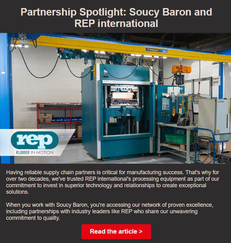 Soucy Baron: Utilizziamo le presse REP per lo stampaggio e sovrastampaggio di vari componenti in gomma. Questi ultimi servono successivamente a diversi settori di attività come ad esempio quelli legati ai veicoli automobilistici, l’agricoltura, l’industria, ecc.